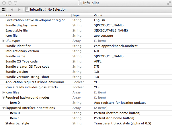 The new iOS configuration section allows you to include native plist settings into your tiapp.xml file. At compile time, Titanium will use these settings when generating your project’s Info.plist. This reduces the need to use a custom Info.plist in your project, and makes it much easier to compare your Titanium settings with those in your xcode project.