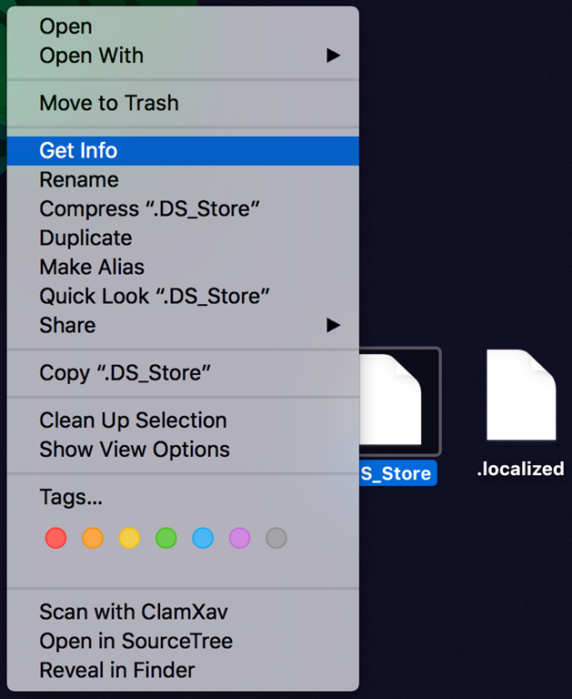 The next step is to right mouse click on the .DS_Store file on your desktop and select “Get Info” as shown below.